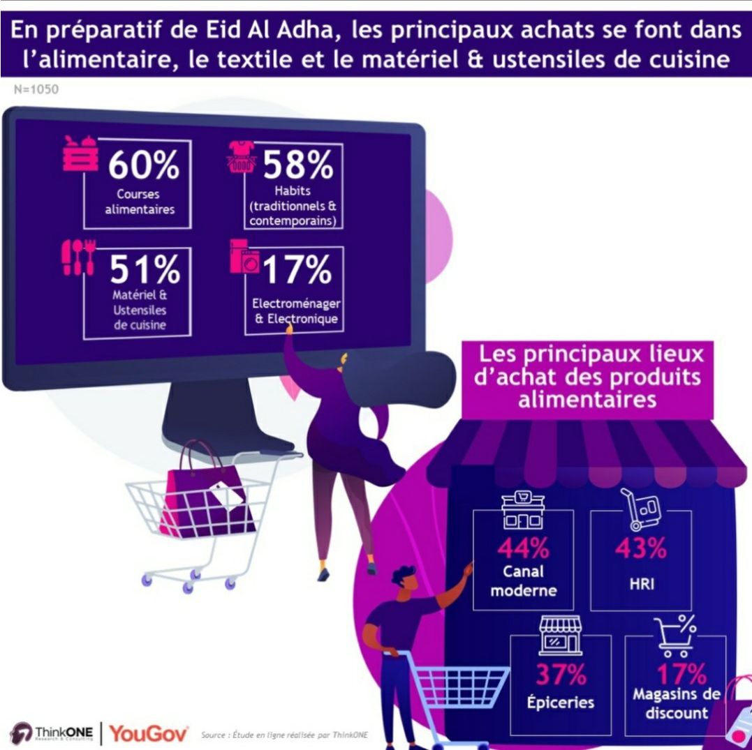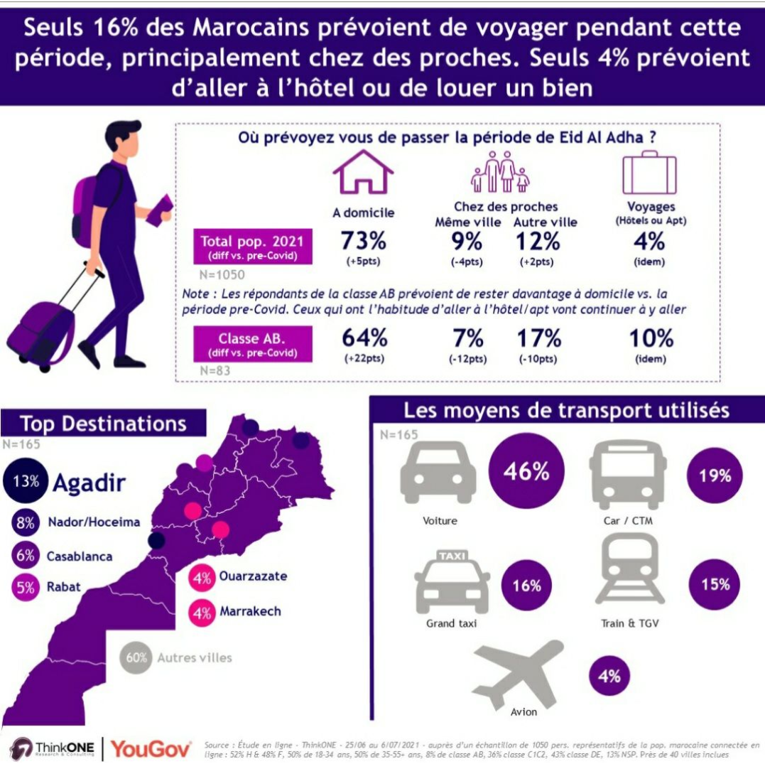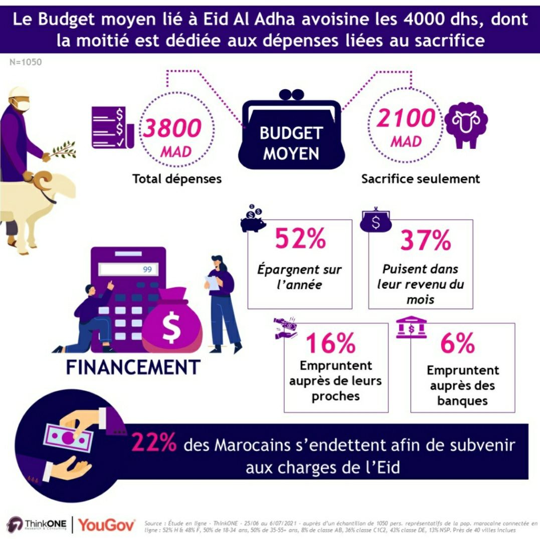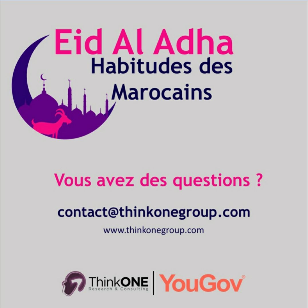 đ€łRĂ©sultats issus d’une Ă©tude ThinkONE rĂ©alisĂ©e en ligne du 25/06 au 6/07/2021, auprĂšs dâun Ă©chantillon de 1050 pers. reprĂ©sentatifs de la pop. marocaine connectĂ©e en ligne : 52% H & 48% F, 50% de 18-34 ans, 50% de 35-55+ ans, 8% de classe AB, 36% classe C1C2, 43% classe DE, 13% NSP. PrĂšs de 40 villes inclues